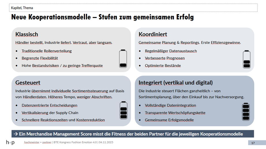 Einen wichtigen Lösungsansatz sieht Harnack in der Entwicklung neuer, datenbasierter Kooperationsmodelle zwischen Handel und Industrie. Er verweist auf Marken wie Opus und Monari, die dies bereits gemeinsam mit ihren Handelspartnern mit großem Erfolg umsetzen und mit denen die Modehändler im h+p-Datenpanel mehr als doppelt so hohe Netto-Roherträge pro Quadratmeter erzielen als im Durchschnitt über alle DOB-Marken hinweg.