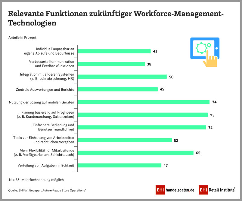 Für die kommenden Jahre sehen Unternehmen erheblichen Bedarf an digitalen Innovationen in nahezu allen Bereichen des Personalmanagements. Von zukünftigen Technologien erwarten über 70 Prozent der Unternehmen vor allem mobile Nutzbarkeit, intuitive Bedienung und intelligente auf Prognosen basierende Planung. Mehr Flexibilität für Mitarbeitende steht bei fast zwei Dritteln (65 Prozent) auf der Wunschliste. Tools zur Einhaltung von Arbeitszeiten und rechtlichen Vorgaben stehen für 53 Prozent oben im Relevanzranking und die Fähigkeit zur Integration mit bestehenden Systemen ist für die Hälfte der Händler besonders wichtig.